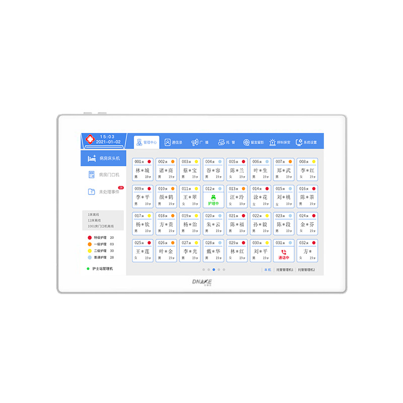 6)床位一覽表:可顯示每路病床智能終端、分機(jī)的患者信息,并支持接入病員一覽表顯示;可以顯示患者姓名、性別、年齡、床位號、護(hù)理等級。